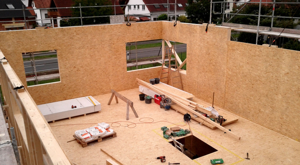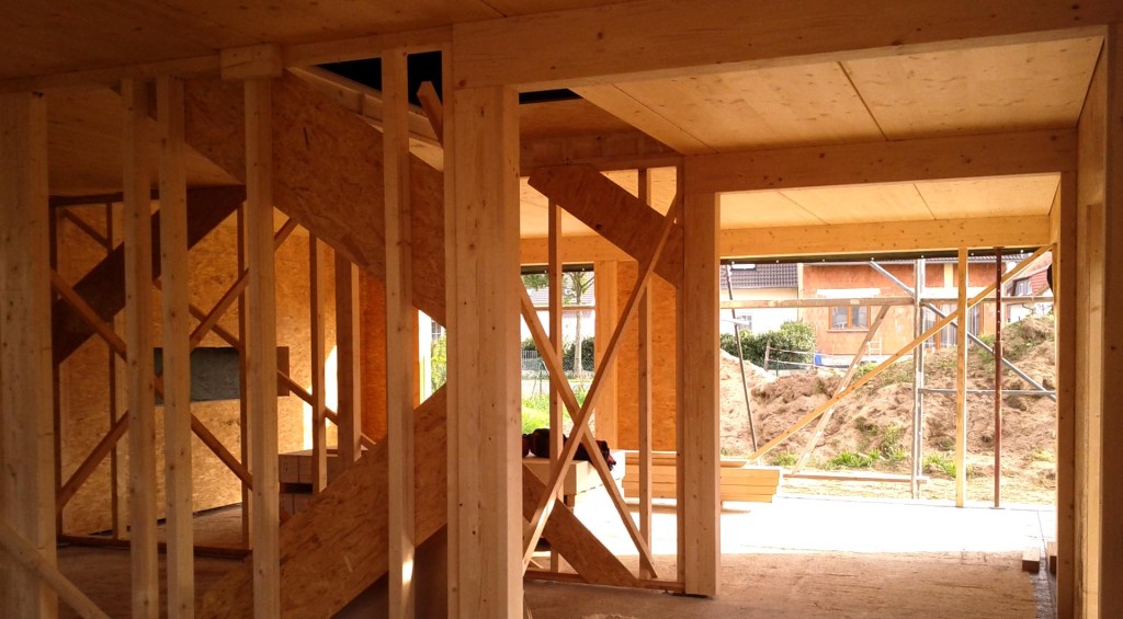 Die einseitig beplankten Rohbau-Wände zeigen die Konstruktion des Holzrahmenbaus.