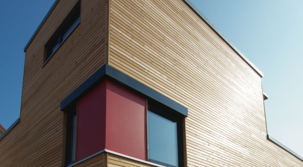 Kubischer Baukörper mit Flachdach. Ausgeführt ohne Dachüberstände. Das Gebäude bietet auf 180qm Wohnfläche einer vierköpfigen Familie ein großzügiges neues Zuhause. Hier zu sehen ist die Eingangssituation mit Eingangsvorbau. Die hinterlüftete Fassade ist eine Rhombus Nut- und Federschalung aus gehobelter Lärche, naturbelassen. Auf einen Keller hat man aufgrund der Grundstückslage verzichtet. Dies ermöglicht einen ebenerdigen Zugang zur Gartenseite.