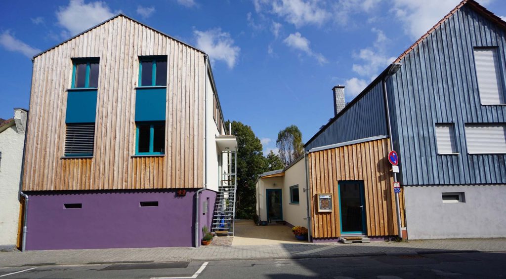 Schöne Details! Tradition (Gewölbekeller) trifft auf modernen Holzbau sowie ein Lieblingsdetail des Bauherrn: Die Millimeterarbeit beim Bau des Ateliers. An der Straßenbeleuchtung sieht man, wie die Baugrenze im vollen Maße ausgenutzt wurde!