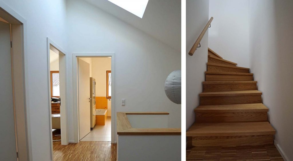 Die Treppe ins zweite Obergeschoss ist aus Odenwald-Eiche hergestellt, die Oberfläche geölt. Die Treppe sollte auf kleinstem Raum untergebracht werden und so haben wir uns in der Planung für eine halb-gewendelte Treppe entschieden.
