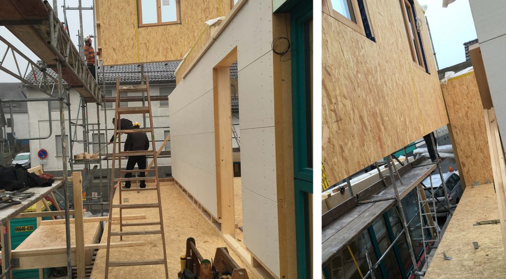 Stück für Stück wächst das Gebäude. Die traufseitigen Fassaden sollen später verputzt werden. Da der Aufbau vor Ort im Winter erfolgte, haben wir uns für eine vorverputzte Holzweichfaserplatte als winddichte Ebene entschieden. Diese hat den Vorteil, dass sie länger unbeschadet der Witterung ausgesetzt werden kann und sich der Verputzer später einen Arbeitsschritt spart.